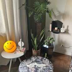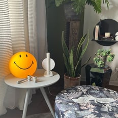Para darle un toque especial, hemos añadido detalles únicos como cojines coloridos de terciopelo y objetos de diseño, que aportan dinamismo y conectan con la temática vegetal.
