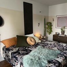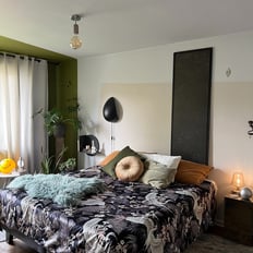 Imaginen despertar cada día en un entorno que evoca la serenidad de un jardín tropical. Hemos utilizado una paleta de colores verdes y naturales para traer la frescura de la naturaleza al interior. Las paredes, pintadas en tonos suaves, crean una atmósfera tranquila y envolvente, mientras que los textiles estampados aportan movimiento y llaman la atención.