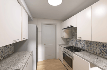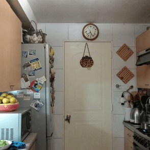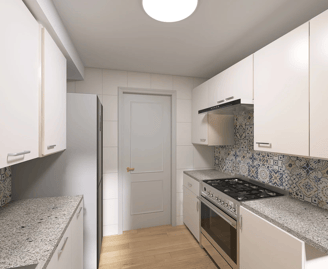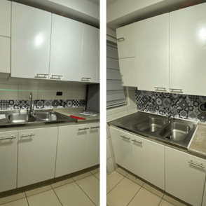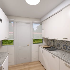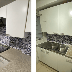 En este caso, nos enfocamos en reducir al máximo el presupuesto: reutilizamos las puertas existentes pintándolas y lacándolas profesionalmente, y añadimos un vinilo que imita las baldosas hidráulicas en las paredes para dar un toque más contemporáneo.